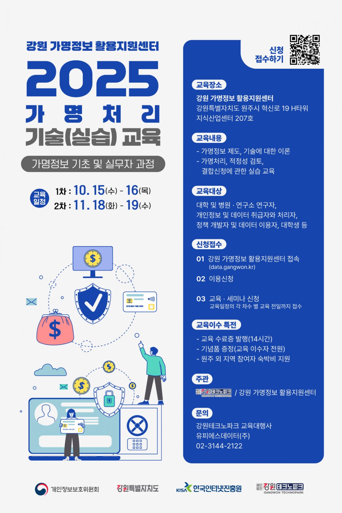 교육&세미나 신청 (2차)2025 가명처리 기술 실습 교육-가명정보 기초 및 실무자 과정(11.18.~19.) ㆍ강좌상태 접수완료 ㆍ접수기간 2025.09.21 (일) 09:00 ~ 2025.11.18 (화) 18:00 ㆍ일자/시간 2025-11-18 (화) 09:30 ~ 17:30(2일) ㆍ자격/정원 10 ㆍ장소 강원가명정보활용지원센터 ㆍ문의처 02-3144-2122 신청마감 목록 보기